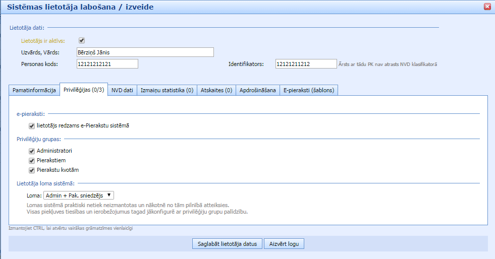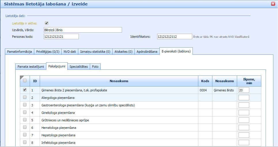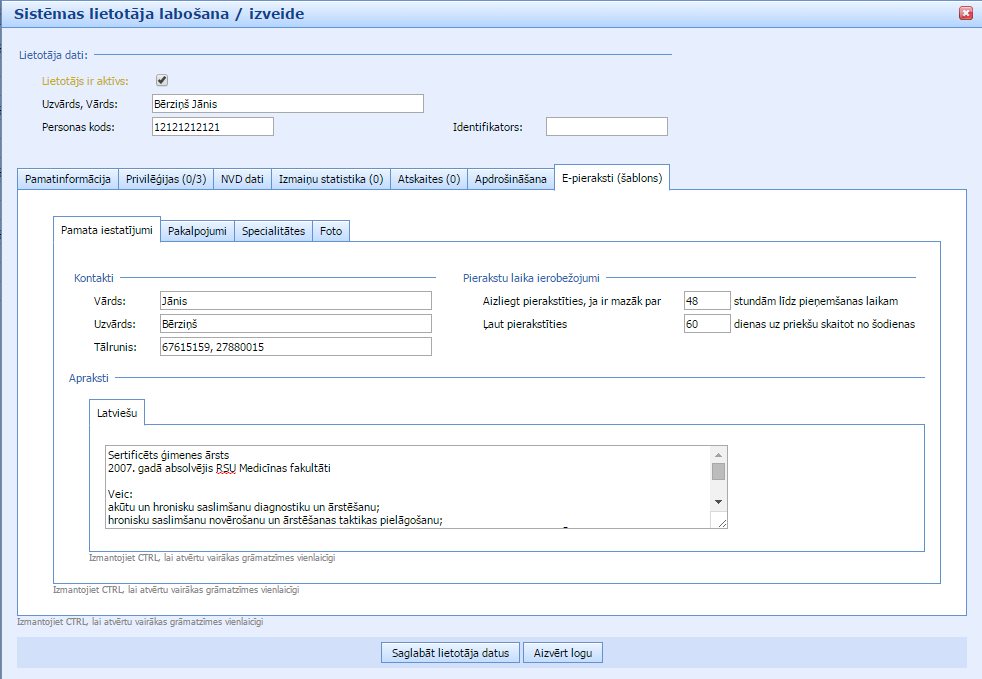 Spiežot uz konkrētu ārstu-lietotāju, atvērsies logs, kurā var labot SmartMedical lietotāja datus. Lai ārsta vizītkarte tiktu publicēta portālā Piearsta.lv lietotāja profila sadaļā “Privilēģijas” ar ķeksīti ir jāatzīmē aile “lietotājs redzams e-Pierakstu sistēmā”. Pēc noklusējuma aile ir tukša un ārsta vizītkarte nav publicēta portālā vispār.