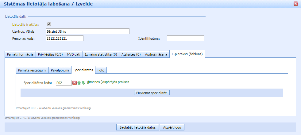 e-Pierakstu šablona apakšsadaļā “Specialitāte” obligāti ir jānorāda ārsta specialitātes kods. Tas būtiski atvieglos pacientam ārsta meklēšanu un nodrošinās iestādi ar pārliecību, ka iestādes ārsts tiks attēlots meklējamo ārstu sarakstā, ja pacienta izvēlētais meklēšanas parametrs būs ārsta specialitāte. Ja ārstam ir vairākas specialitātes, tad spiežot pogu “Pievienot specialitāti” tiks pievienota papildus aile, kur jānorāda otrās specialitātes kods.