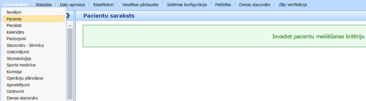 Sadaļu “Pacients” atver no izvēlnes SmartMedical. Šeit var sistematizēti pārvaldīt informāciju par pacientiem – papildināt vai koriģēt pacienta informāciju pacienta kartē, veidot nosūtījumus. Elektroniskā pacienta karte ietver: personas pamatdatus, kontaktinformāciju, informāciju par apdrošināšanas polisi, datus no NVD informācijas sistēmas.