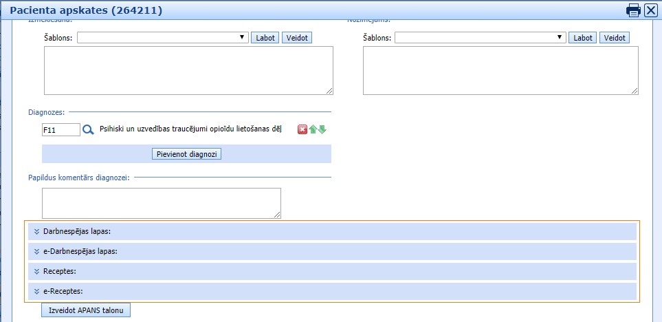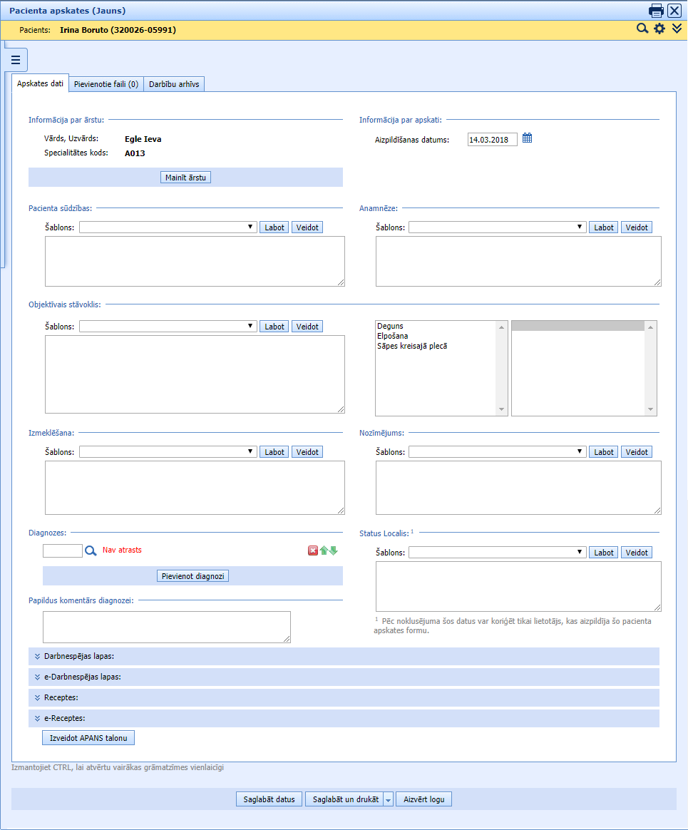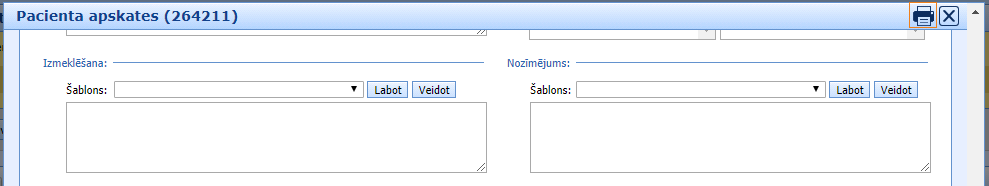 Ārsta apskates formu kā arī citās medicīniskas formās ir iespējams aizpildīt ar šablonu palīdzību. Informācija par šablonu izveidi un pielietošanu ir pieejama “Sadaļa “Pacients”” > “Medicīniskās veidlapas sadaļā “Pacients”” > “Šabloni medicīniskas formās” (Veidlapa)