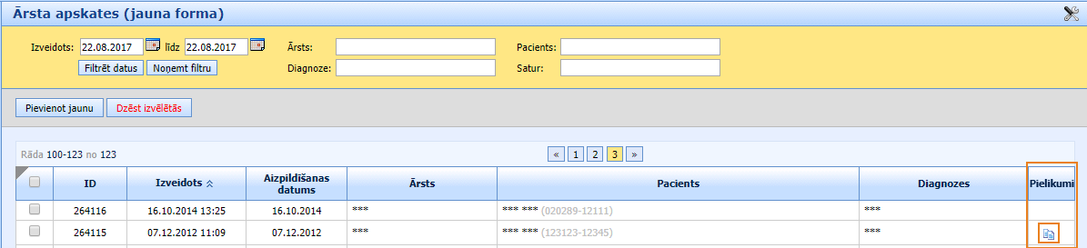Ārsta apskates sarakstā piezīme par pievienoto failu
