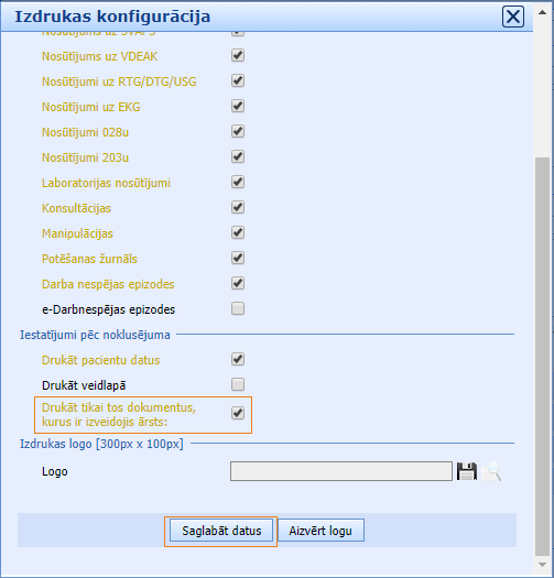 Atvērsies iestatījumu logs, kur ir jāieliek ķeksītis pretī “Drukāt tikai tos dokumentus, kurus ir izveidojis ārsts”. Ārsta apskates izdrukā tiks drukātas tikai tas receptes un darbnespējas lapas, kurus izrakstījis esošais lietotājs.