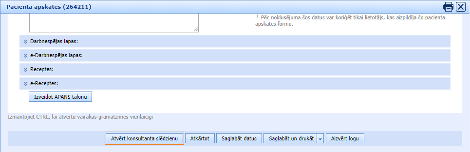 Ārsta apskates formā parādās jauna poga “Veidot slēdzienu”. Nospiežot pogu veidojas Konsultācijas slēdziens, kas ir sasaistīts ar pacienta apskates formu. Konsultācijas slēdziena formā automātiski aizpildīsies šādi lauki: