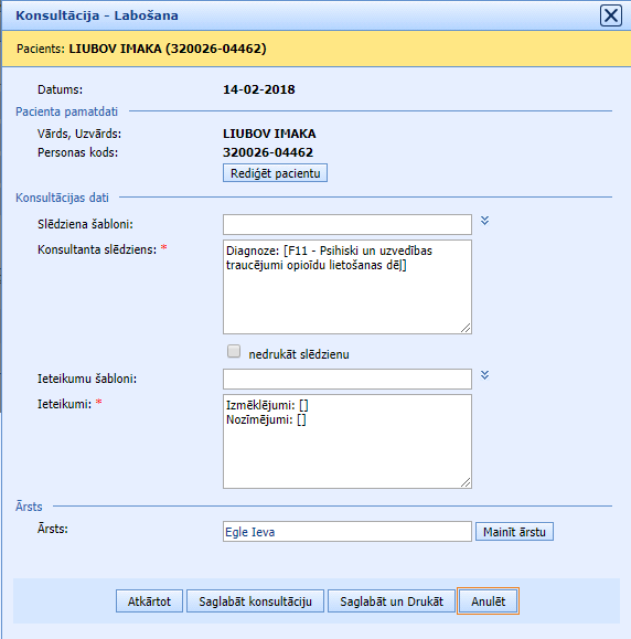 Izveidoto slēdzienu var anulēt no Konsultācijas labošanas formas. Anulēts slēdziens atsaistās no ārsta apskates.
