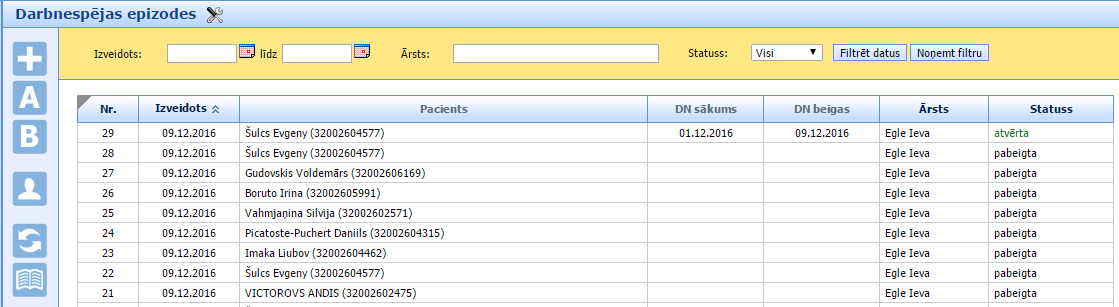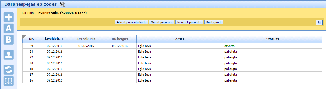 Ja pacientu sarakstā ir meklējams pacients, tad spiežam uz to un sistēma atvērs sarakstu ar šī pacienta darbnespējas epizodēm.