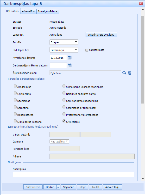Tā kā pacientam nav atvērtas epizodes un lapas, tad sistēma piedāvā izveidot jaunu epizodi – spiežam pogu “Izveidot jaunu epizodi”.Atvērsies nākamais logs ar darbnespējas lapas B formu: