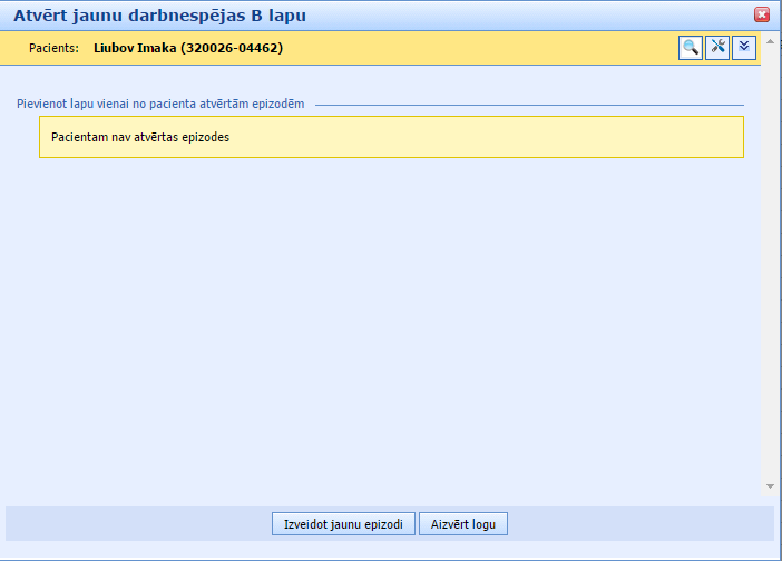 Piemēram, mūsu izvēlētajam pacientam iepriekš netika izrakstītas darbnespējas lapas un viņam nav atvērtas epizodes. Tad šajā gadījumā, pēc pacienta izvēles atvērsies jauns logs ar informāciju par epizodēm: