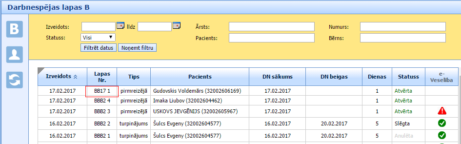 Darbnespējas B lapu sarakstā pirms DNL numura tiek attēlots jaunā žurnāla kods: