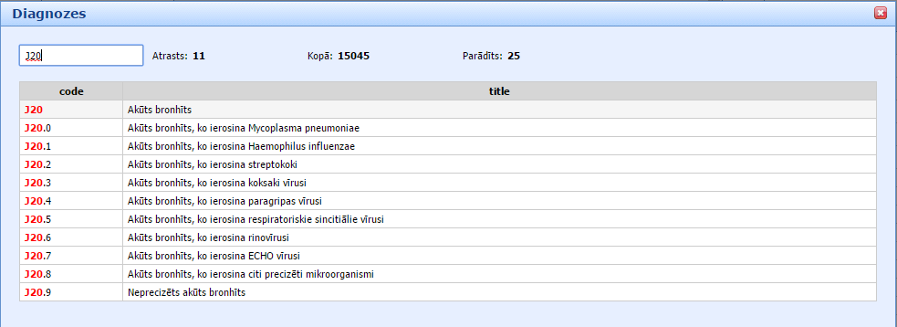 , atveras logs ar meklēšanas lauku, kurā ievada diagnozes kodu vai diagnozes nosaukuma fragmentu. Klikšķinot ENTER taustiņu uz klaviatūras, sistēma attēlo meklēšanas rezultātus: