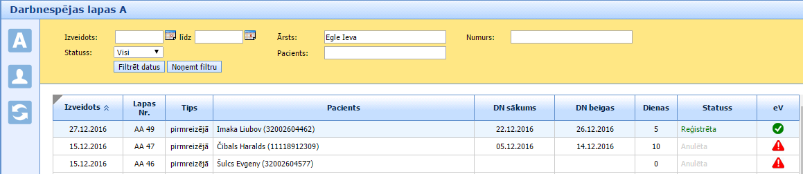 Lai papildinātu atvērtu A lapu, sadaļas “Darbnespējas lapas A” sarakstā, izvēlas A lapu, kuru vēlas papildināt.