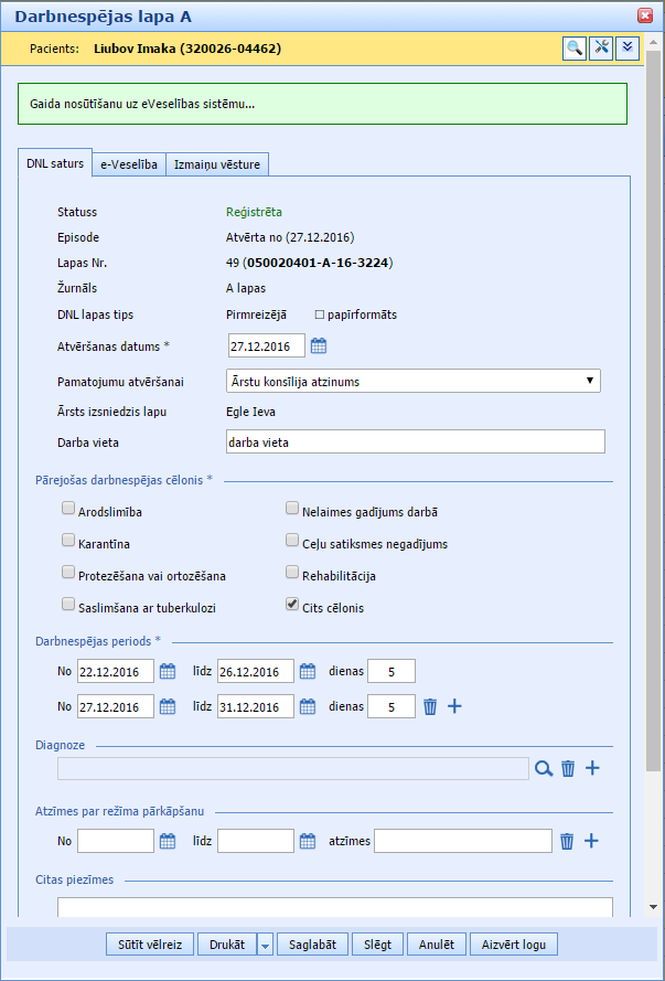 Kad visi papildinājumi ir ievadīti, klikšķina pogu “Saglabāt”. Papildināta darbnespējas lapa tiek saglabāta SmartMedical sistēmā un izmaiņas nosūtītas uz e-Veselības sistēmu. Ja darbnespējas lapas statuss DNL lapu sarakstā ir nomainījies uz