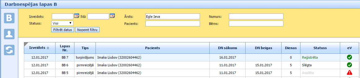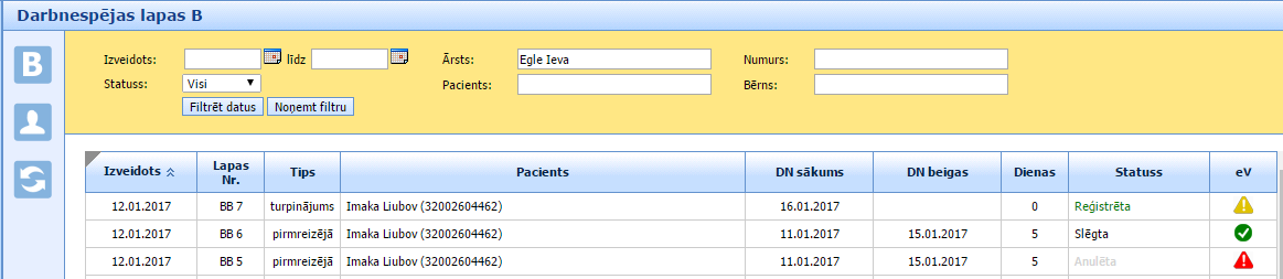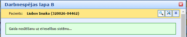 Kad SmartMedical sistēma saņems atbildi no e-Veselības sistēmas, tad e-Veselības statuss sarakstā un paziņojums darbnespējas lapas formā arī automātiski mainīsies. Piemērā darbnespējas lapa tika piereģistrēta un statuss e-Veselības sistēmā ir