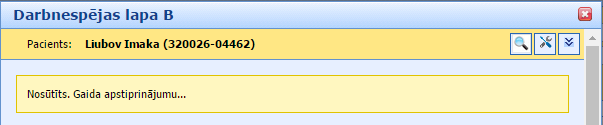 Pēc formas aizpildīšanas saglabājam darbnespējas lapu, spiežot pogu “Saglabāt”.Spiežot pogu “Saglabāt” – lapa statusā “Atvērta” tiek saglabāta SmartMedical sistēmā un tiek nosūtīta reģistrācijai e-Veselības sistēmā. Logā augšdaļā parādīsies paziņojums ka Jūsu izveidota darbnespējas lapa A – turpinājums gaida nosūtīšanu uz e-Veselības sistēmu.