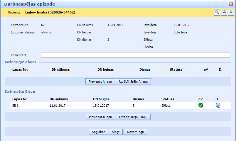 Atverot epizodi, var redzēt arī sasaistītas darbnespējas lapas: