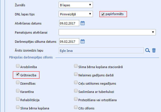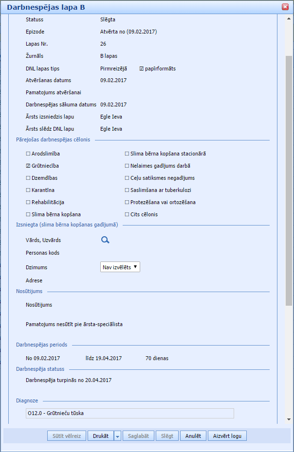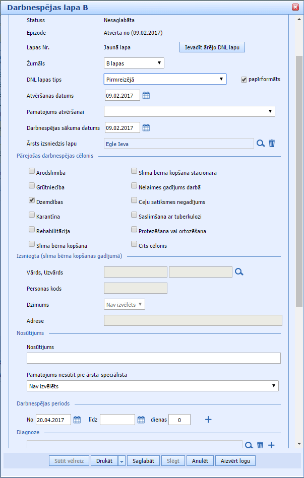8. Atvērsies formā, kurā mēs obligāti norādām: – darbnespējas lapas tipu- darbnespējas lapas formātu: papīrformāts- atvēršanas datumu- cēloni: dzemdības- darbnespējas sākuma datumu – mūsu piemērā 20.04.2017un saglabājam šo lapu, spiežot pogu “Saglabāt”.
