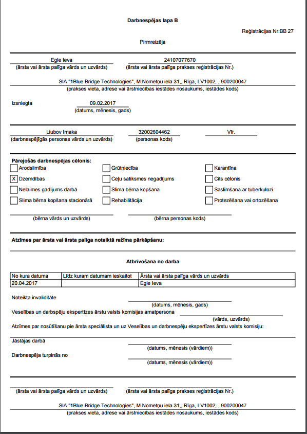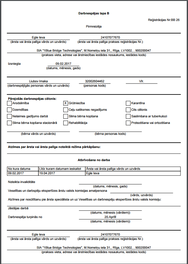 7. Tagad atvērsim otro darbnespējas lapu B ar datumu 20.04.2017, spiežot pogu