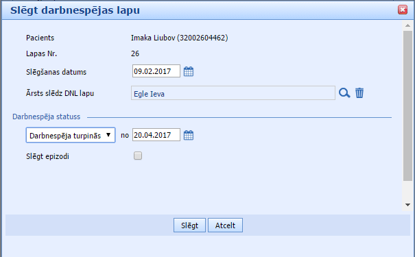 4. Uzreiz šo lapu varam arī slēgt. Norādām diagnozi un spiežam pogu “Slēgt”. Atvērsies logs, kurā norādām, ka darbnespēja turpinās. Mūsu piemērā šīs datums būs 20.04.2017.
