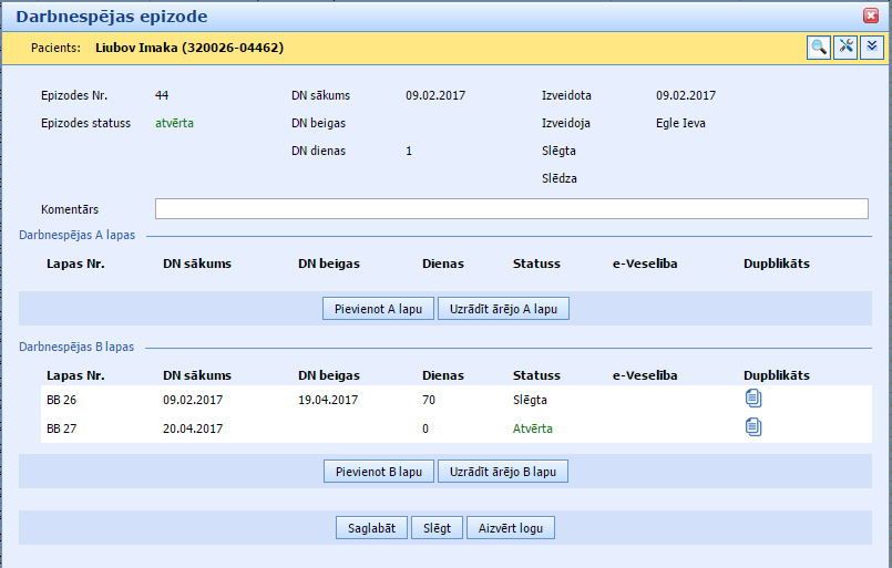 pretī sadaļai “Darbnespējas lapas B” sānu izvēlnē un izvēloties to pašu pacienti. Tā kā atverot pirmo lapu, mēs automātiski atveram arī epizodi, sistēma paziņos, ka pacientei ir atvērta epizode.