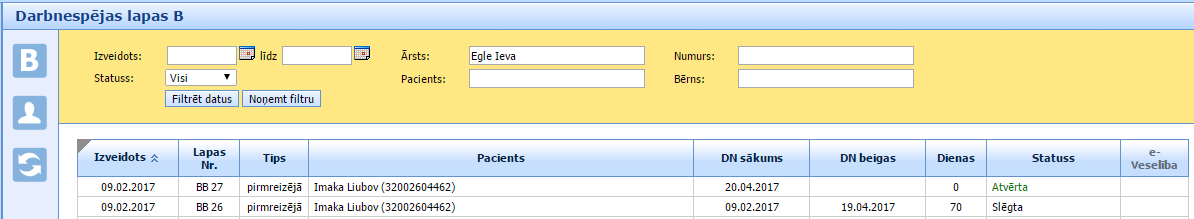 pretī sadaļai “Darbnespējas lapas B” sānu izvēlnē un izvēloties to pašu pacienti. Tā kā atverot pirmo lapu, mēs automātiski atveram arī epizodi, sistēma paziņos, ka pacientei ir atvērta epizode.