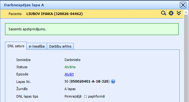 - statuss “Atvērta” – SmartMedical sistēmā lapai tiek piešķirts statuss un numurs no e-Veselības sistēmas,