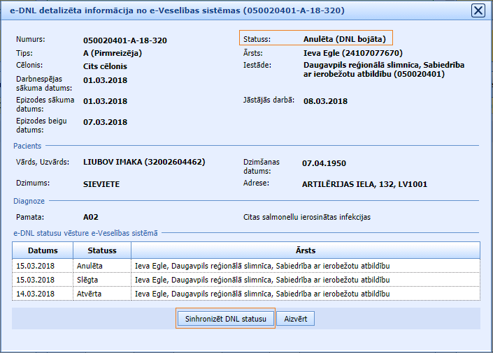 Ja saņemot informāciju no e-Veselības sistēmas, DNL statusi sistēmās ir atšķirīgi, tiek attēlota poga “Sinhronizēt DNL statusu”: