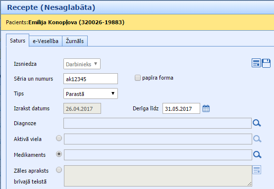 - receptes tips (pēc noklusējuma “Parastā recepte”, bet to var mainīt uz “Īpašo”)
