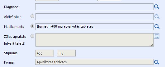 - forma (tiek aizpildāms automātiski, ja medikaments tiek izvēlēts no klasifikatora vai tiek aizpildāms manuāli, ja no klasifikatora tiek izvēlēta viela)