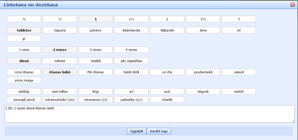 Sistēma automātiski aizpilda arī laukus “Stiprums” un “Forma”, lietojot informāciju no klasifikatora. Pārējos laukus aizpildām manuāli. Lauku “Lietošana” var aizpildīt rakstot brīvo tekstu vai lietojot šablonus, spiežot pogu