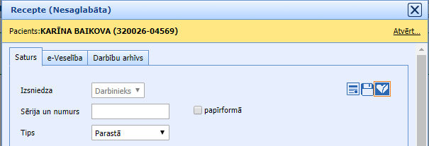 Pieprasot e-Recepšu sarakstu no jau izrakstītas e-Receptes formas, e-Recepšu sarakstā šī e-Recepte tiek attēlota uz dzeltena fona:
