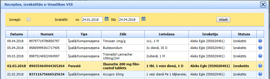 Klikšķinot pogu, atveras e-Recepšu saraksts. Tajā var norādīt atlases kritērijus: e-Recepšu izrakstīšanas periodu un/vai e-Receptes medikamenta izsniegšanas statusu. Pēc pogas “Atlasīt” nospiešanas parādās atbilstošo e-Recepšu saraksts: