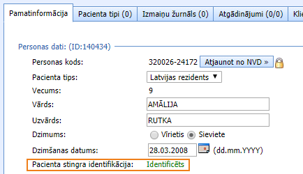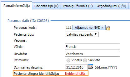 ja pārbaudes rezultātā tika atrasta informācijas neatbilstība stingras identifikācijas noteikumiem, tad pacienta kartē ir redzams ieraksts: [ Pacienta stingra identifikācija: Neidentificēts ]. Zemāk minētajā piemērā pacienta norādītais personas kods neatbilsts Latvija rezidenta personas koda formātam, kā arī nav aizpildīts lauks ar dzimumu.
