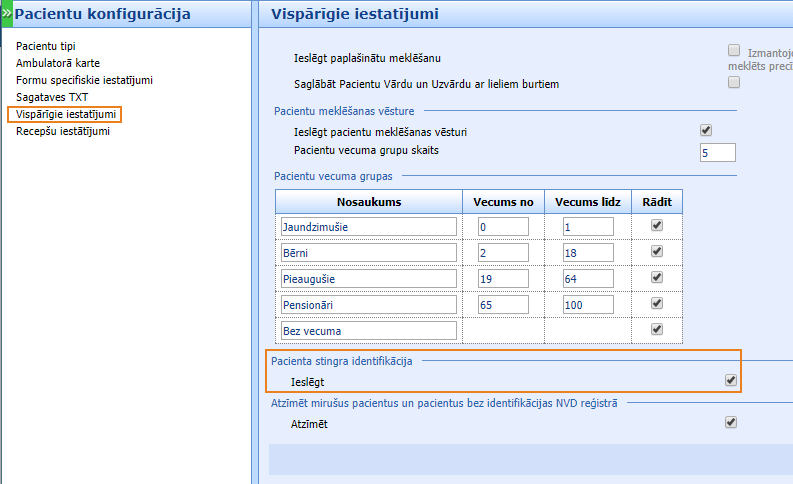 Sadaļā “Sistēmas konfigurācija > Pacientu konfigurācija > Vispārīgie iestatījumi” var ieslēgt stingras identifikācijas funkcionalitāti.