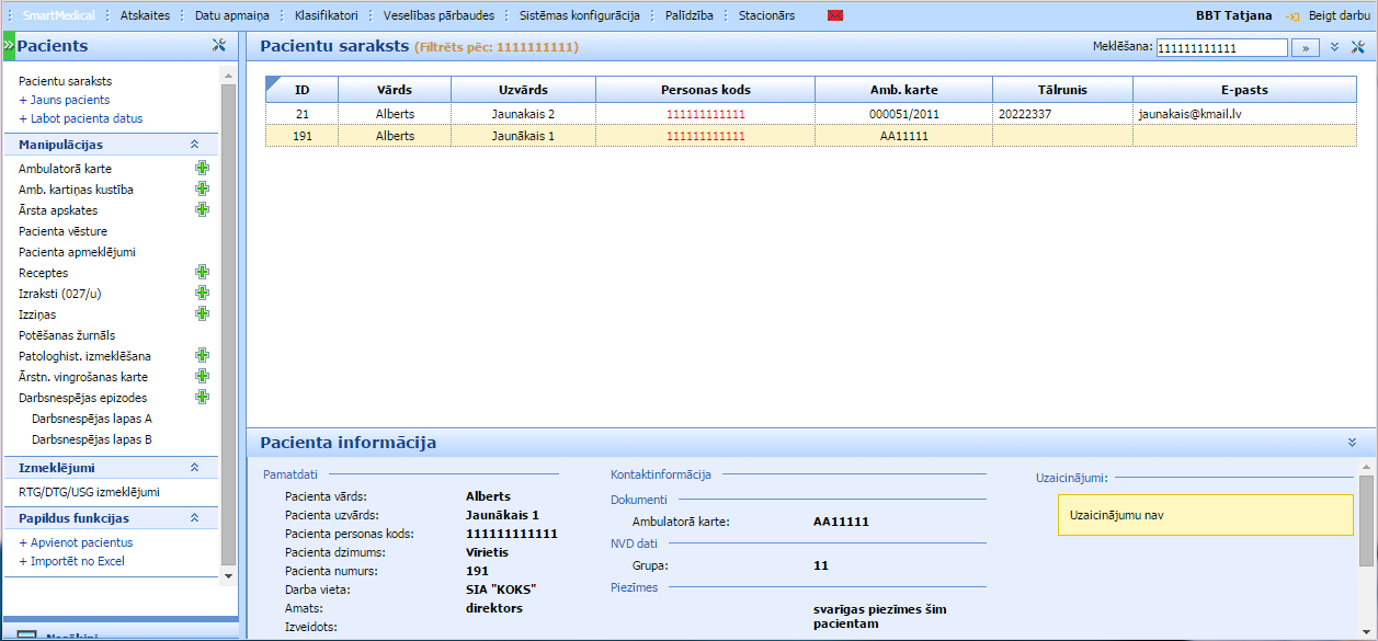 Pastāv gadījumi, kad steigā tiek veidotas vairākās pacienta kartes vienam pacientam – viens ārsts aizpilda vienu karti, otrs – citu. Lai ievestu kārtību jūsu iestādes vai prakses pacientu datu bāzē mēs speciāli izstrādājam funkciju pacientu datu apvienošanai. Tā darbojas dažos soļos. Meklējot pacientu pēc personas koda sadaļā SmarMedical -> Pacients, atradām vienu un to pašu pacientu, kam ir reģistrētas 2 ambulatorās kartes