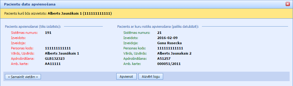 Šajā logā, kreisajā pusē (sarkanā krāsa) ir pacienta karte, no kuras dokumenti tiks pārnesti uz karti, kas atrodas loga labajā pusē (zaļā krāsa). Ja piedāvātais variants apmierina tad spiežam pogu “Apvienot pacientus“. Ja Jūs vēlāties samainīt kartes vietām, tad spiežam pogu “Samainīt vietām” un pēc tam pogu “Apvienot pacientus“.