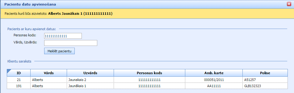 Sistēma atrādīs pacientus ar vienādiem personas kodiem, vārdiem vai uzvārdiem. Spiežot uz pacientu piedāvātā sarakstā, atvērsies jauns logs, kurā sistēma piedāvā apvienot pacientu kartes un atstāt tikai vienu ambulatoru karti.