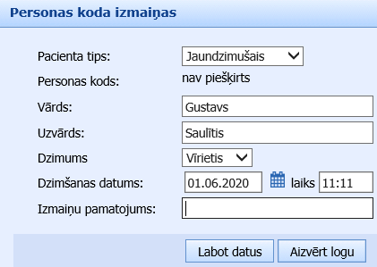 Rediģējot šī tipa pacienta datus, lauks “Personas kods” nav pieejams informācijas ievadīšanai.