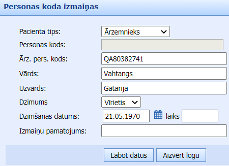 Pacientiem ārzemniekiem ir izveidota iespēja ievadīt ārzemnieka personas kodu atsevišķā laukā “Ārzemnieka personas kods“. To izmanto apdrošināšanas norēķinu noformēšanai.Izvēloties pacienta tipu “Ārzemnieks“, formā “Personas koda izmaiņas” lietotājam tiek iespējots lauks “Ārzemnieka pers. kods” un atspējots lauks “Personas kods“. Lietotājs ievada ārzemnieka personas kodu, ievada izmaiņu pamatojumu un saglabā informāciju, klikšķinot pogu “Labot datus“.