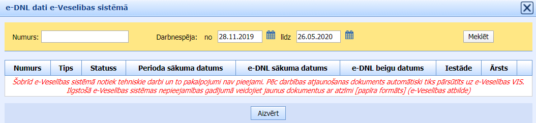 Tāpat, mēģinot meklēt darbnespējas lapu e-veselības sistēmā, lietotājam tiek attēlota informācija par e-veselības sistēmas atteici: