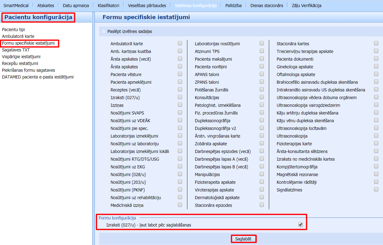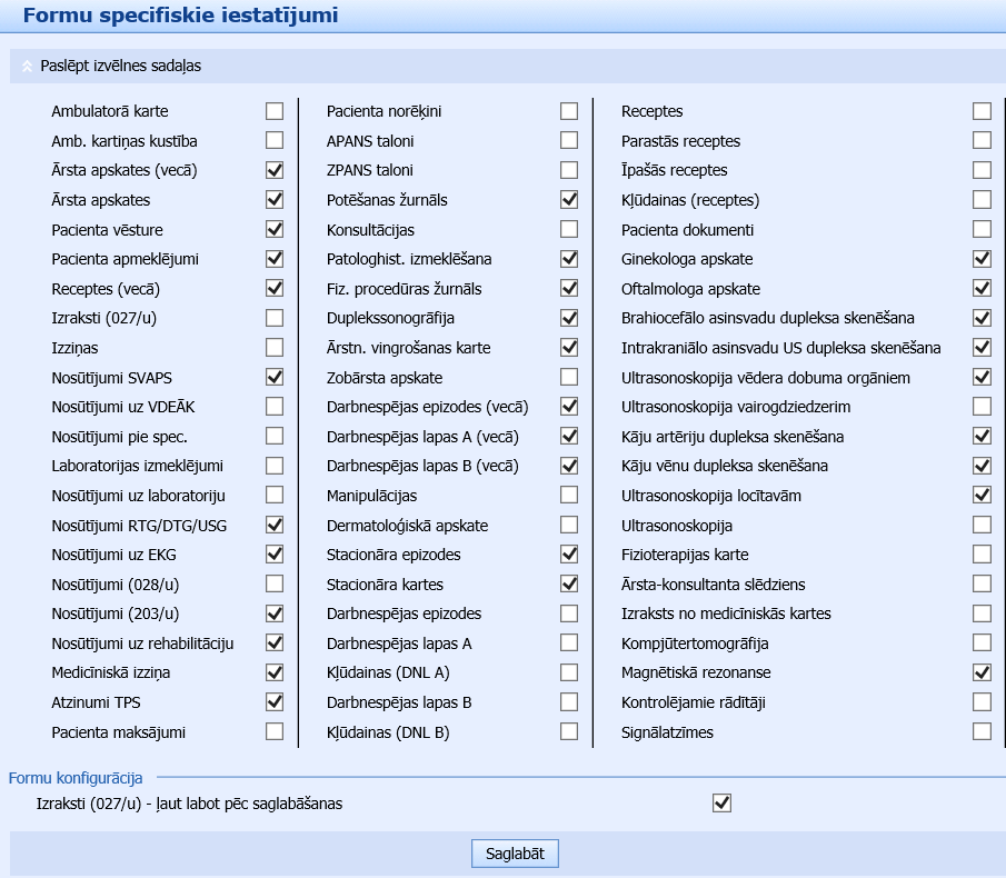 Tā kā lietotāji parasti neizmanto visas sadaļas “Pacients” veidlapas un formas, iespējams paslēpt formas, kas nav aktuālas. Iestatījumus var mainīt sadaļā “Sistēmas konfigurācija > Pacientu konfigurācija > Formu specifiskie iestatījumi”. Lai paslēptu nevajadzīgās formas, tās atzīmē ar ķeksīti formas un izmaiņas saglabā.