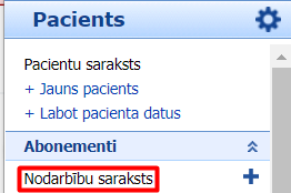 Kad pacients vēlas izmantot abonementu, lietotājs klikšķina Abonementu moduļa sadaļā “Nodarbību saraksts” uz + ikonas vai Pacienta moduļa tāda paša nosaukuma sadaļā uz + ikonas: