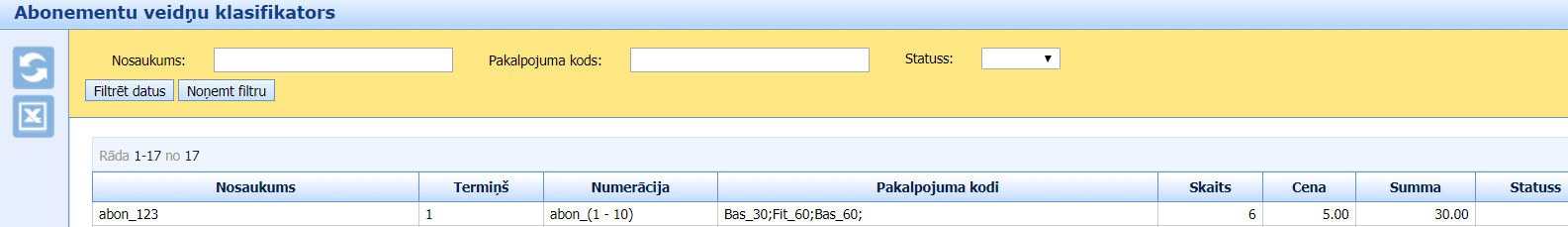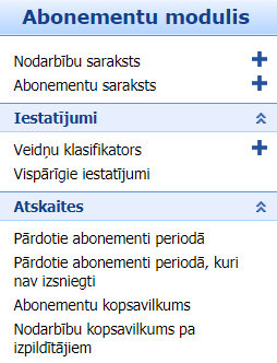 Abonementu modulī pieejamas šādas sadaļas (skat: attēlu pa kreisi).