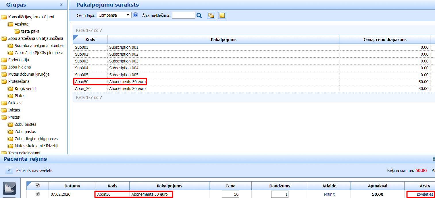 Svarīgi, lai apmaksājot abonementa pakalpojumu, rēķinā kā pakalpojuma sniedzējs būtu izvēlēts ārsts ar atbilstošām tiesībām abonementu modulī, tas ir, ārsts ietilptu kādā no grupām, kam piešķirtas tiesības “Pakalpojumu sniedzējs“.
