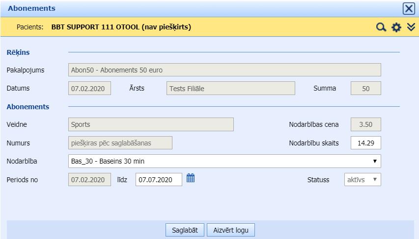 Lai varētu pacientam izveidot abonementu, viņam jāapmaksā rēķins par pakalpojumu, kas ietilpst noteiktā iepriekš definētā pakalpojumu grupā. Piemēram, varat nosaukt šo pakalpojumu grupu “Abonementi”. Kā arī jābūt definētai veidnei, kas tiks izmantota abonementa veidošanai.
