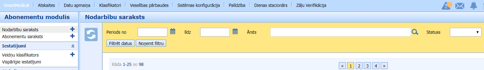 Izvēlnē Smart Medical klikšķina izvēli “Abonementu modulis“. Atveras saskarne abonementu pārvaldībai, kuras labajā pusē nekas netiek attēlots, kamēr lietotājs nav veicis izvēli.