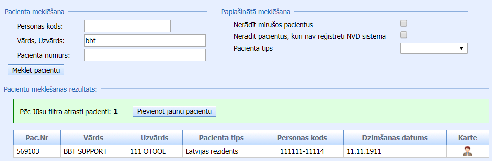 Jāizvēlas pacients, klikšķinot uz pacienta izvēles ikonas (ja veidojot rēķinu pacients nebija izvēlēts) un izvēloties pēdējo pacientu vai mainot pacientu – atlasot vajadzīgo.