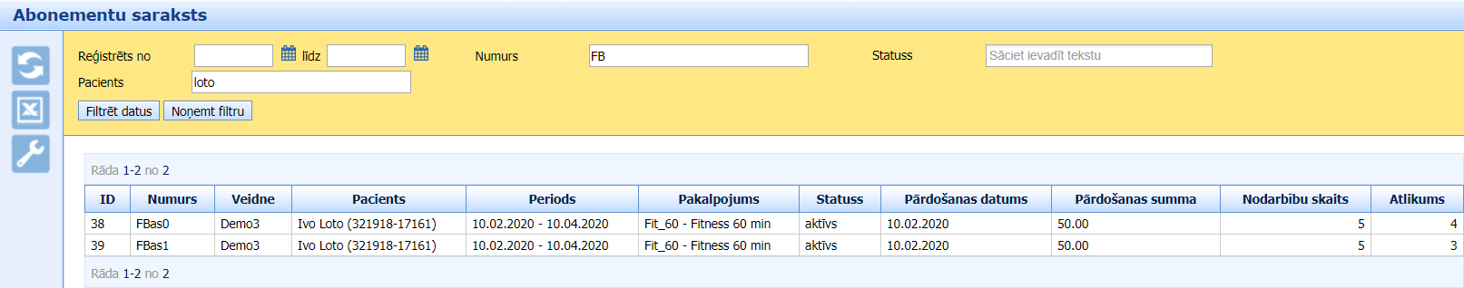 Lietotājs klikšķina pogu “Saglabāt“, lai pievienotu izvēlēto nodarbību abonementa nodarbībām. Nodarbības statuss tiek atzīmēts kā “Reģistrēta“. Pārlūkojot abonementu sarakstu, var pārliecināties, ka izvēlēta pacienta pieejamo abonementa nodarbību skaits pēc nodarbības reģistrēšanas ir samazinājies. Skat. aili “Atlikums“: