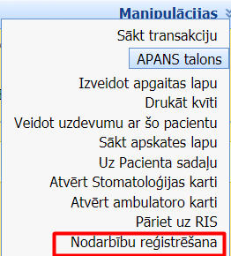 Nodarbību reģistrēt var arī no pierakstu saskarnes. Ja izveidots pieraksts un tas izvēlēts, formas labajā apakšējā stūrī pieejama izvēlne, kuras pēdējā izvēle atver saskarni nodarbības reģistrēšanai:
