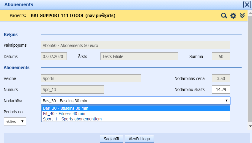 Klikšķinot laukā “Nodarbība“(atverot izkrītošo sarakstu), var aplūkot nodarbības, kas iekļautas abonementā (pamatojoties uz veidni).