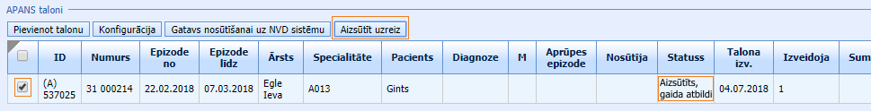 • Aizsūtīt uzreiz – atzīmējot APANS talonus stacionāra kartes sekcijā “APANS taloni” vai NVD atskaišu sarakstā un klikšķinot pogu “Aizsūtīt uzreiz”, talons tiks sūtīts uz NVD VIS un būs atrodams aizsūtīto NVD talonu sarakstā (sk. sarakstu sadaļā Atskaites > NVD atskaites) vai statusu dienas stacionāra kartes sekcijā “APANS taloni”:
