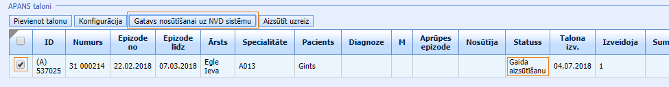 • Gatavs nosūtīšanai uz NVD sistēmu – ieķeksējot APANS talonu(s) izvēles rūtiņā un klikšķinot šo pogu, tiek mainīts talona statuss uz “Gaida aizsūtīšanu“. Talons tiks attēlots šajā sekcijā un NVD talonu sarakstā statusā “Gaida aizsūtīšanu” (sk. sarakstu sadaļā Atskaites > NVD atskaites),